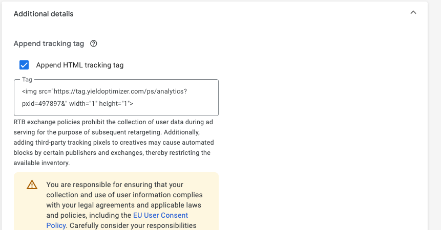 - Within “Additional Details”, check the “Append additional HTML tag” box and click “Add HTML.” Copy your Analytics pixel HTML code and paste it into the “Tag” field.