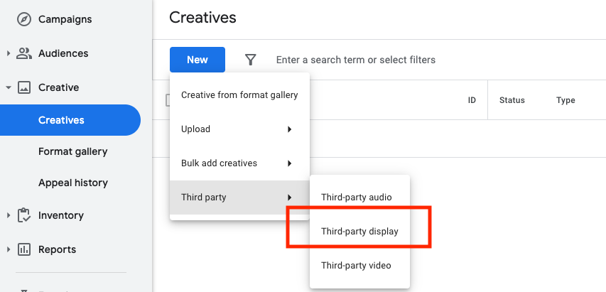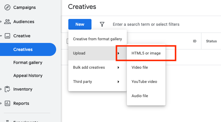 - Click on the “HTML5 or image” in the dropdown menu to begin submitting a hosted creative.