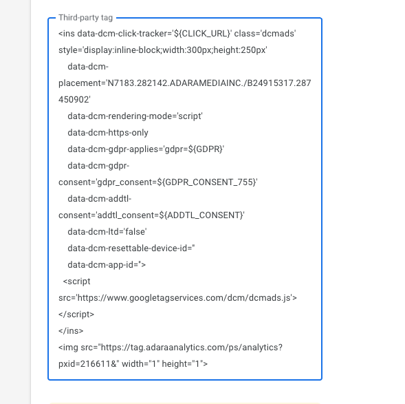 - Paste in your tag in the "Third-party tag" section (this works for any type of tag: Iframe, JavaScript), and add the Image Format Impact Analytics Pixel to the end of the creative code as shown below.